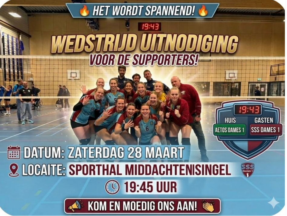 Zaterdag 28 maart speelt Dames1 een super belangrijke wedstrijd. Aetos Dames1 staat momenteel op de tweede plek en de tegenstander SSS DAMES 1 staat eerste.